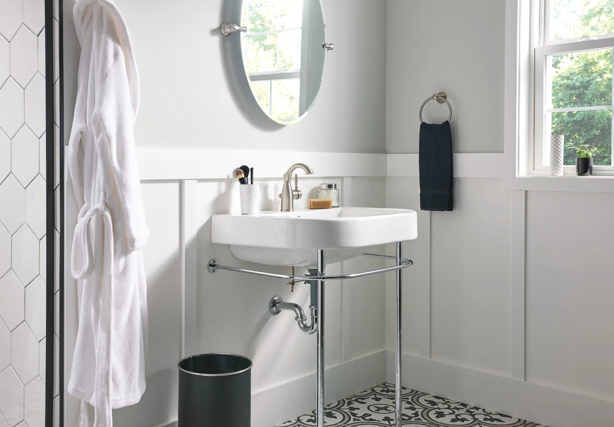 Full of charm and character, Sarona draws on a style reminiscent of rustic farmhouses. This Traditionally styled single-handle faucet features a uniquely sculpted spout for eye-catching appeal.
