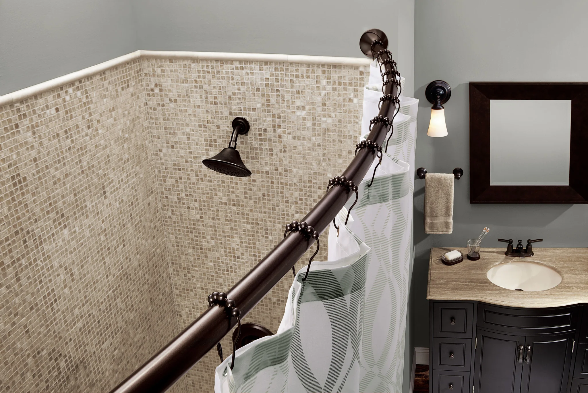 Moen® Tension Curved Shower Rods add a decorative touch to the bath while enhancing space in the shower. The tension bar is easy to install without tools and can adjust from 57” to 60” to accommodate varying shower sizes. In addition, the covers provide a stylish accent while concealing the mounting hardware, allowing for a clean and refined look. They are available in many finishes to coordinate well with any bathroom aesthetic.