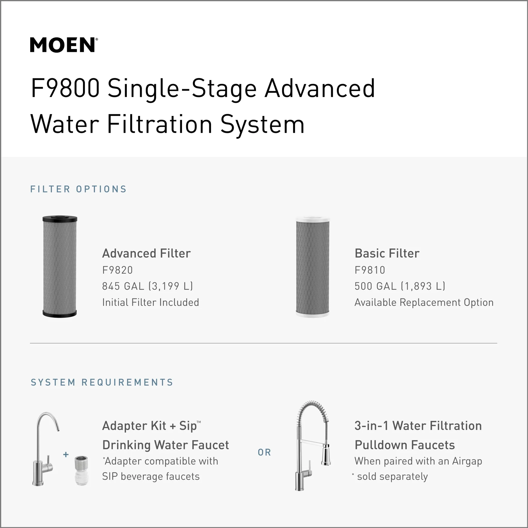 The Advanced Water Filtration System is Moen’s best water filtration system. Moen’s Advanced Water Filtration packs a similar performance of multi-stage carbon filtration into a single- stage design if you're looking to improve at-home water quality. The system removes over 70 known water contaminants while also improving the taste, color, and clarity of your drinking water—all while reducing the frequency and quantity of replacement filters to keep your system running at its best.